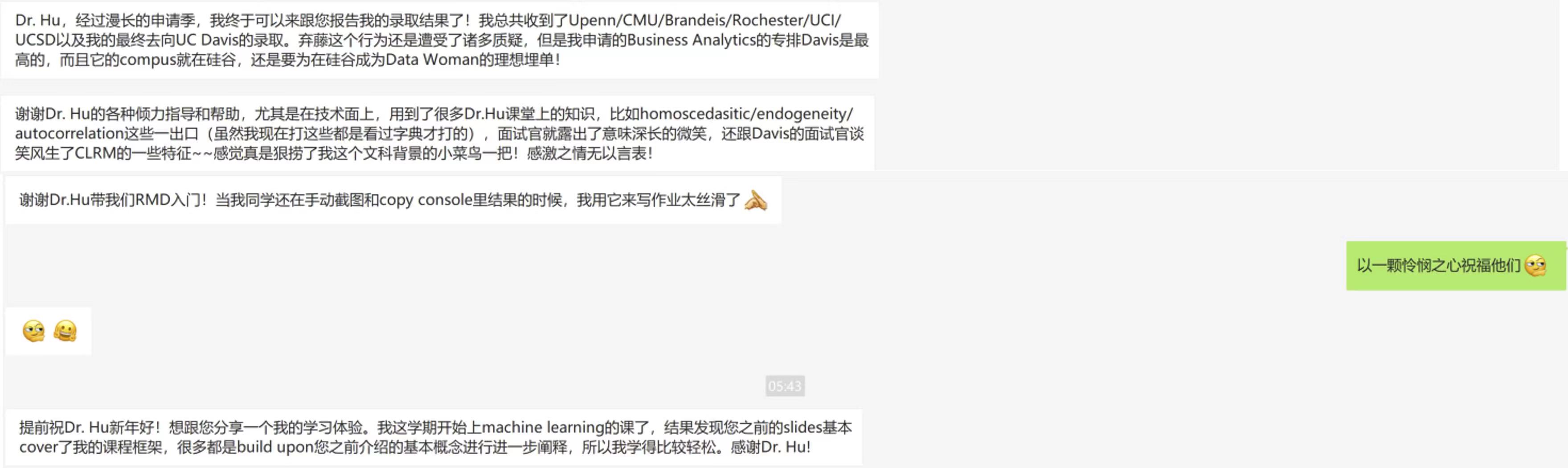 上课过程中,胡悦会将前沿理论方法融入其中,但按他自己的话说,“我是个彻彻底底的文科生出身,一定要教文科生能听得懂的课程”。在课上,他教会员工如何“直面惨淡的数学,正视淋漓的公式”,又叮嘱大家“我们是社会科学家,不是统计学家或数据科学家”,要学会用数据“讲常人听得懂的话”,增进读者对现实政治的理解。他在二次元、三次元反复横跳,动漫、电影、美剧、B站视频都成为信手拈来的“教具”;本人更成为有名的段子手,自诩为“King of Anti-Jokes”。不懈的努力,换来了同学们的认可和喜爱。令胡老师更为欣慰的是,课上的知识不只为员工后来申请名校提供了帮助,还为他们之后的能力提升奠定了坚实基础。