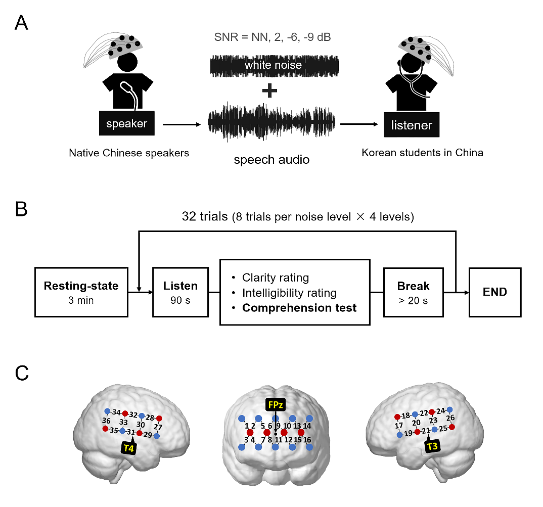 伴随着全球化的进程,越来越多的人们学习并使用一门新的语言来进行跨文化沟通。然而,日常生活中的言语沟通环境总是存在噪声,它对非母语言语的理解带来了很大的干扰。本研究旨在探索噪声条件下非母语言语理解的神经机制。研究招募了一批在中国生活了一段时间、具有较高中文水平的韩国员工,让他们倾听了一系列添加了不同噪声强度的中文音频,并使用近红外光谱成像技术测量了他们的神经活动。其中,中文音频以及讲者的神经活动都来自课题组已发表的母语研究(Li et al. 2021)。