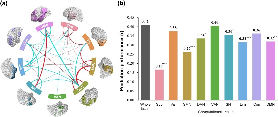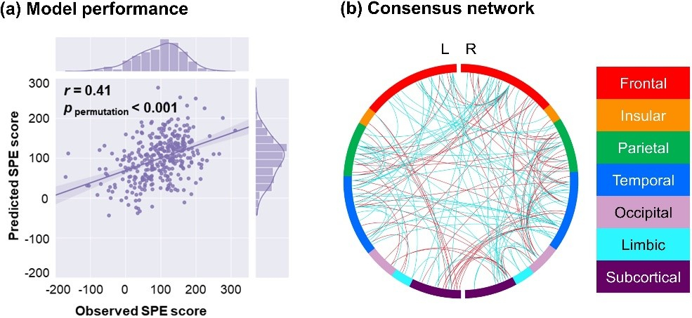 结果显示,个体静息状态下的大脑自发活动可以预测自我偏向行为。模型识别的自我优势脑网络在另一批独立样本中也得到了验证。在预测过程中,部分脑区(如前额叶和丘脑)与功能网络(如默认模式网络)的贡献突出,表明其可能是自我优势加工背后的神经机制。