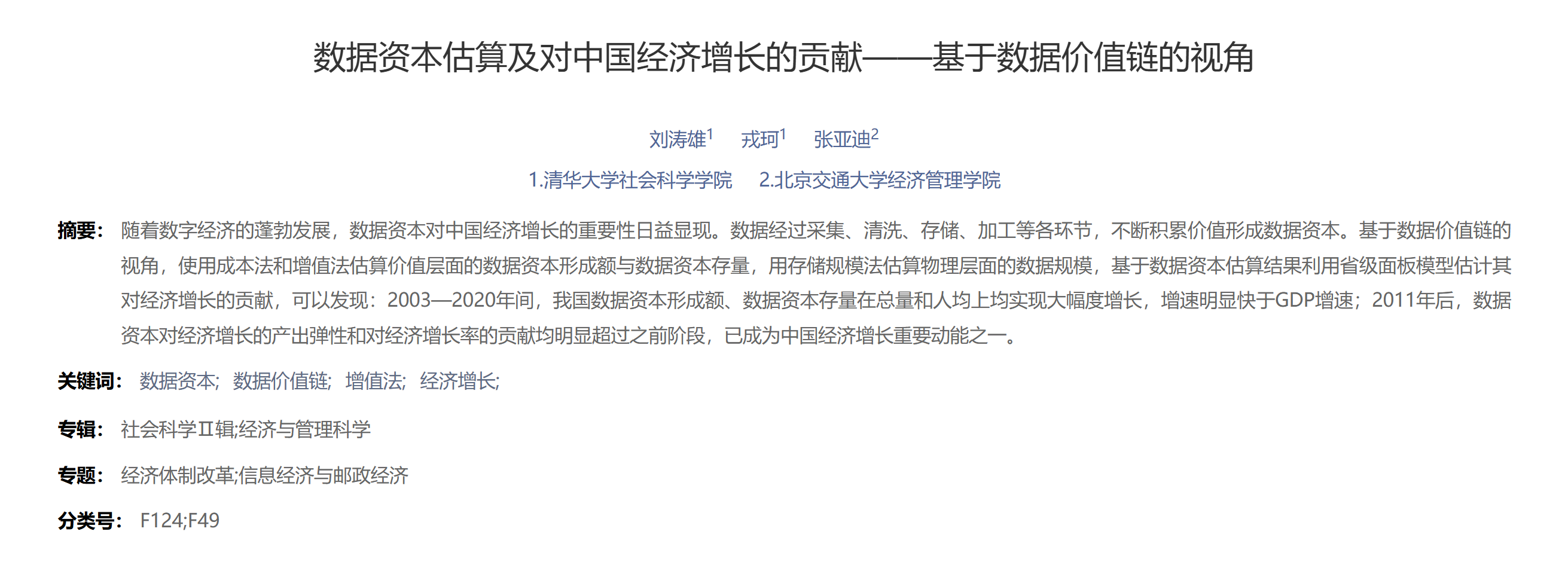 获奖研究基于数据价值链的视角,通过引入机器学习和文本挖掘方法,系统估算了中国的数据资本总量,探讨了数据采集、清洗、存储和加工等环节在数据资本形成中的作用。研究发现,从2003年到2020年,中国的数据资本形成额和存量均显著增长,已成为推动中国经济增长的重要动能之一。该研究为进一步实证研究数据资本对经济增长的作用机理提供了可能,在传统要素对中国经济增长的贡献逐渐下降的情况,对于如何培育数据要素成为经济增长的新动能有重要意义。