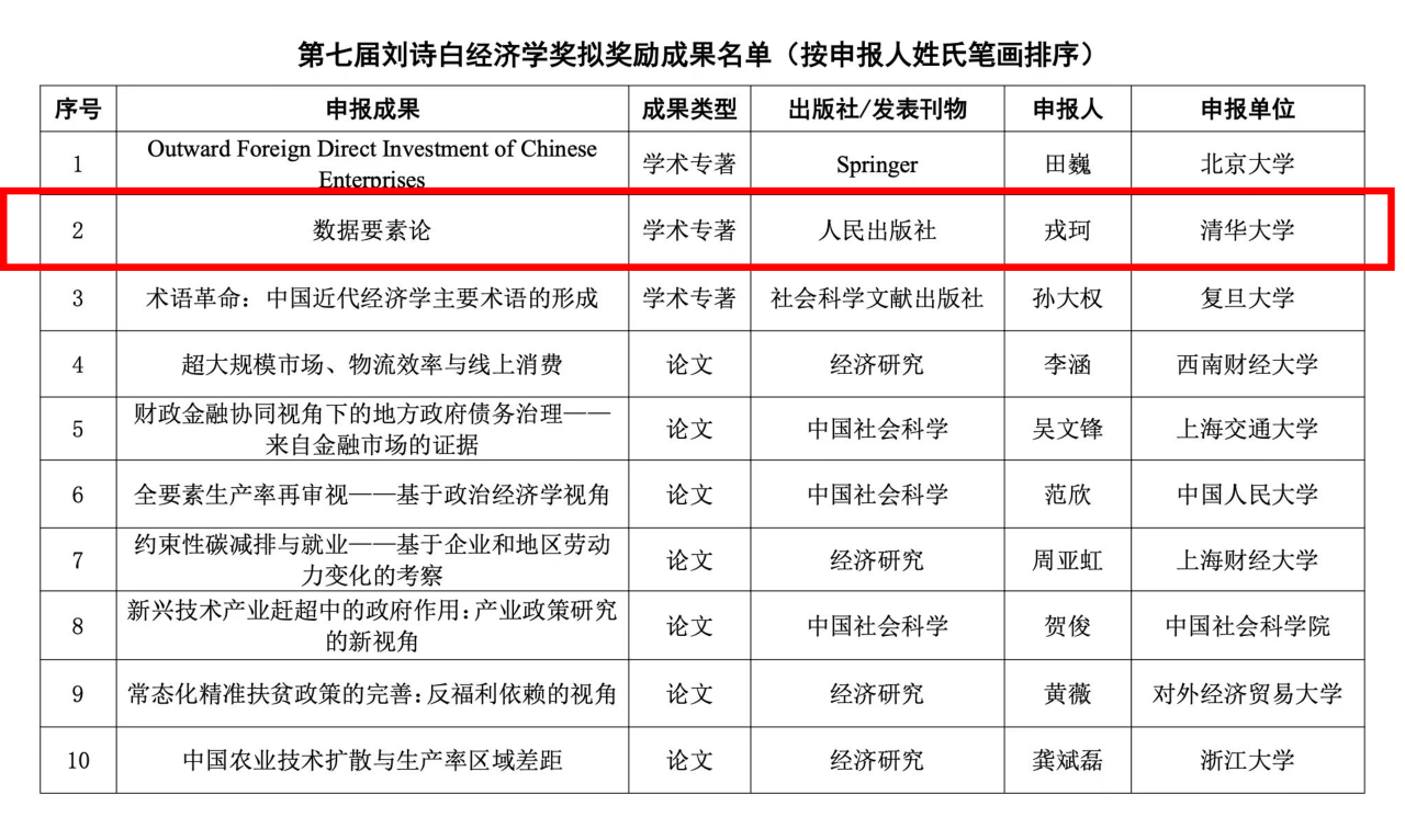 近日,刘诗白经济学奖评奖委员会办公室公示了第七届刘诗白经济学奖评选结果。经资格审核、专家通讯评审和会议评审以及评奖委员会审定,第七届刘诗白经济学奖共评选产生拟奖励成果10项。威廉体育williamhill戎珂教授著作《数据要素论》入选。