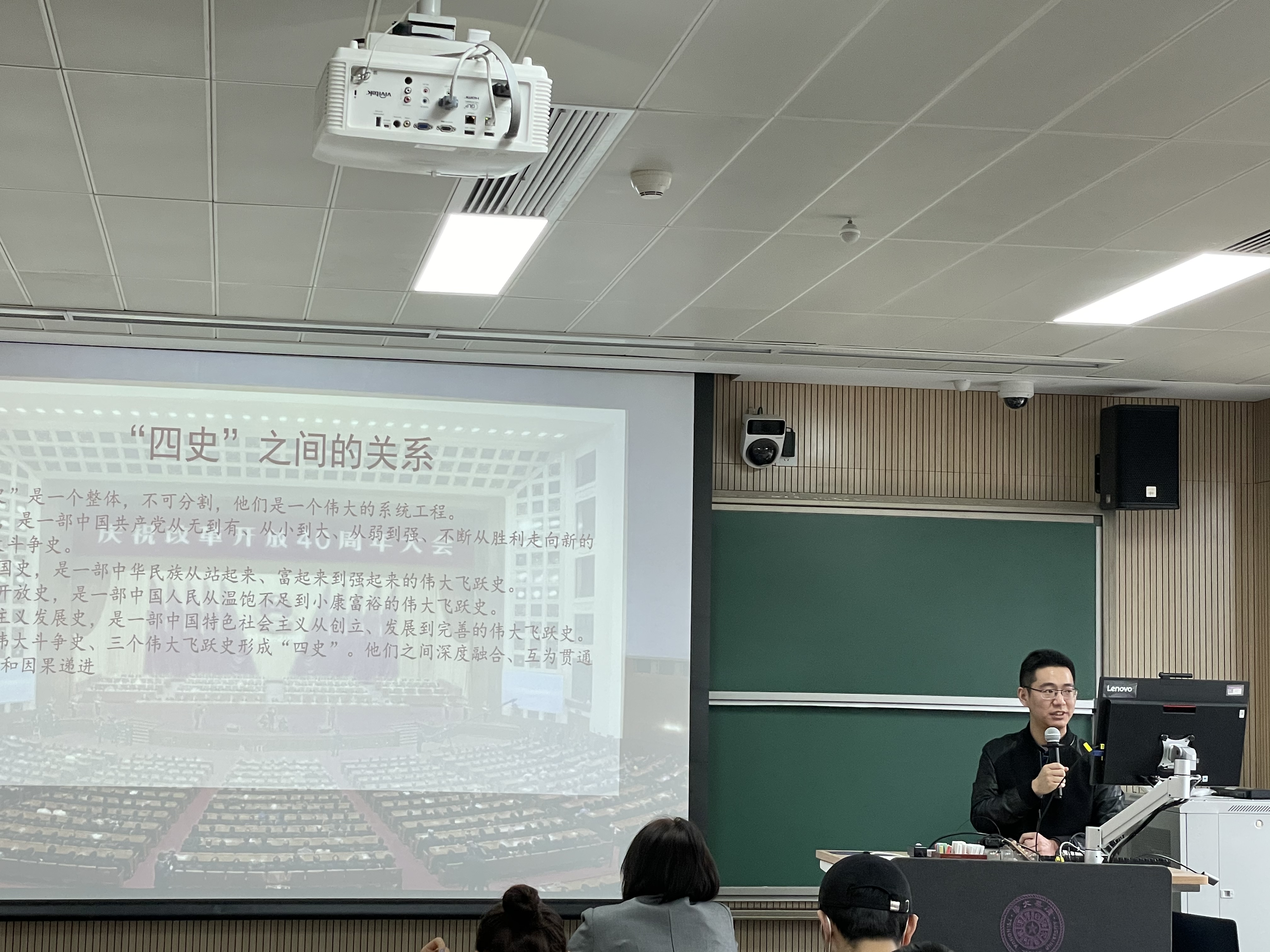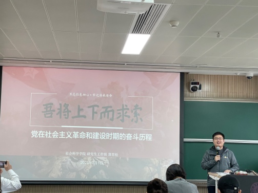 在集中学习党史环节,本科生辅导员柳悰耀、李秋甫、研究生德育工作助理郭育松、马逸凡,根据中国共产党发展历程从新民主主义革命时期、社会主义革命和建设时期、改革开放和社会主义现代建设新时期、中国特色社会主义新时代四个阶段分别行分享学习。从不同时期,不同角度,风格各异的展现了中国共产党波澜壮阔100年的辉煌历史。
