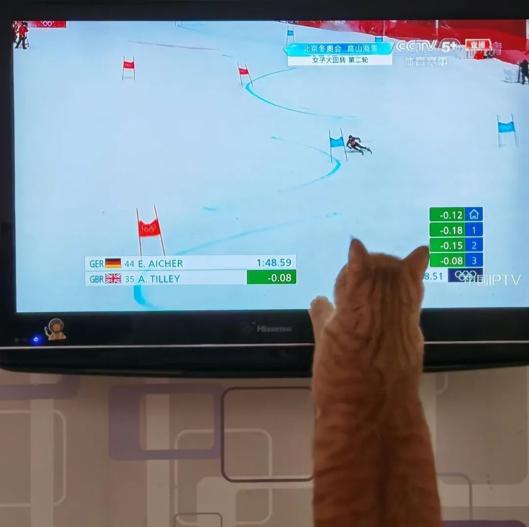 有趣的是,一天在看高山滑雪比赛的过程中,我家小猫看见了电视机里飞速下降滑行、不断绕杆转弯的比赛选手,便用爪子试图“抓住”她们的英姿。屡次无果后,便乖乖地回到我身边,在沙发上烤着火陪我一起看完整场比赛。