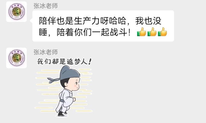 虽然在同学们的坚持下,张冰后来只是偶尔陪大家伙熬夜工作,但是他的心里还总是记挂着自己的员工,经常晚上睡不踏实。凌晨两点在群里给同学们送上温暖的鼓励,凌晨三点又在群里给同学们加油鼓劲,同学们总能感受到张冰时时刻刻的关心,就像他跟同学们说的那样,“陪伴也是生产力,我陪着你们一起战斗。”