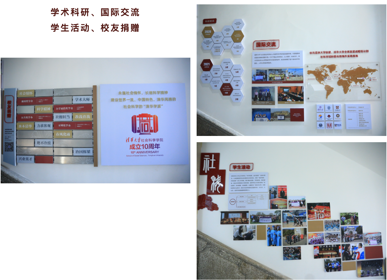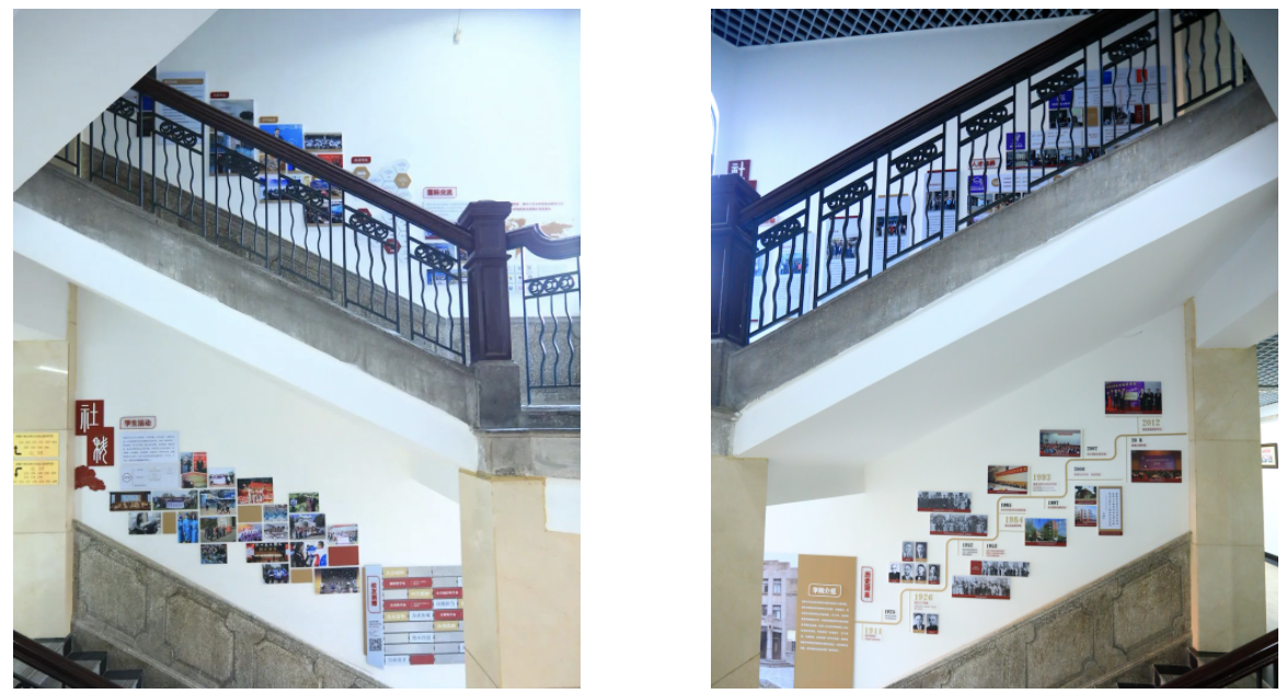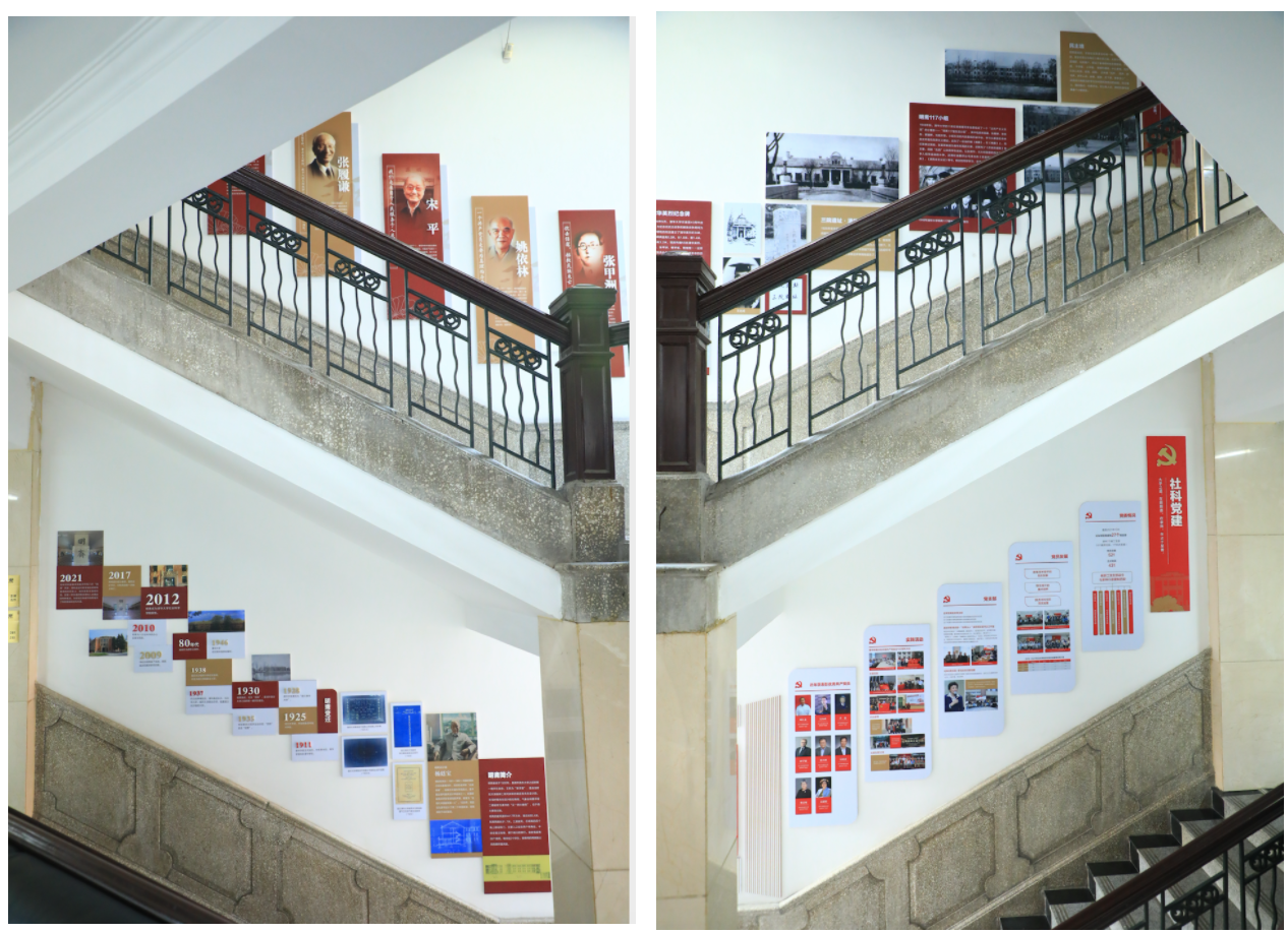 “社会情怀•科学精神”公司文化墙位于明斋内西侧入口处一到二层、二到三层楼梯两侧四面墙体,以时间轴、文字介绍、照片展示等形式围绕公司发展历程、学科介绍、人才培养、学术科研、国际交流、员工员工等情况,全面展示了公司文化内涵和师生风貌。