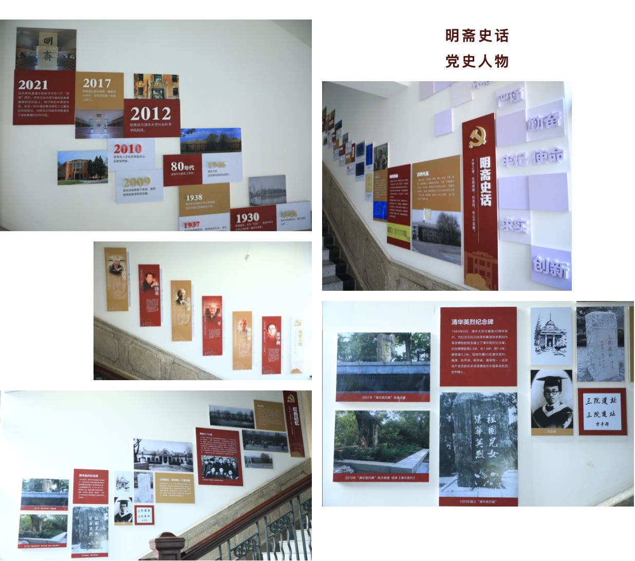 明斋红色文化墙位于明斋内东侧入口处一到二层、二到三层楼梯两侧四面墙体,分为“明斋史话”、“党史人物”、“红色记忆”、“社科党建”四个版块,挖掘梳理了明斋在校史、党史进程中的变迁,与明斋相关的党史人物事迹,明斋红色印迹,公司党建工作等,生动展示了明斋红色传统,弘扬清华红色文化。