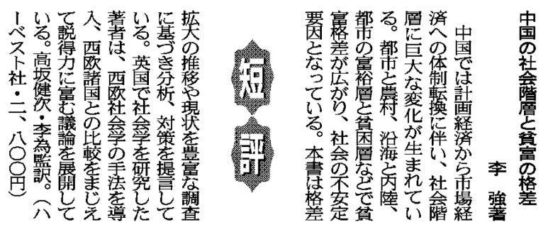 此书在日本出版后,不久就得到了广泛关注。2004年3月14日,《日本经济新闻》刊登了一则短评介绍了此书。这段短评主要表达的意思是:“中国在从计划经济向市场经济体制转型的过程中,社会阶层发生了巨大变化。城乡、沿海内陆、城市富裕阶层和贫困阶层等之间的贫富差距不断扩大,已经成为社会不稳定的一个重要因素。本书根据大量调查数据,分析了中国贫富差距扩大的历程和现状,并提出了应对措施和建议。作者在英国学习社会学,引入了西方社会学的研究方法,还运用中西方比较的视角,展开了说服力充足的论述。”