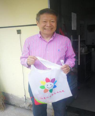 2016年5月李老师收到阳光社区居民自己设计的logo手提袋后在社区留影